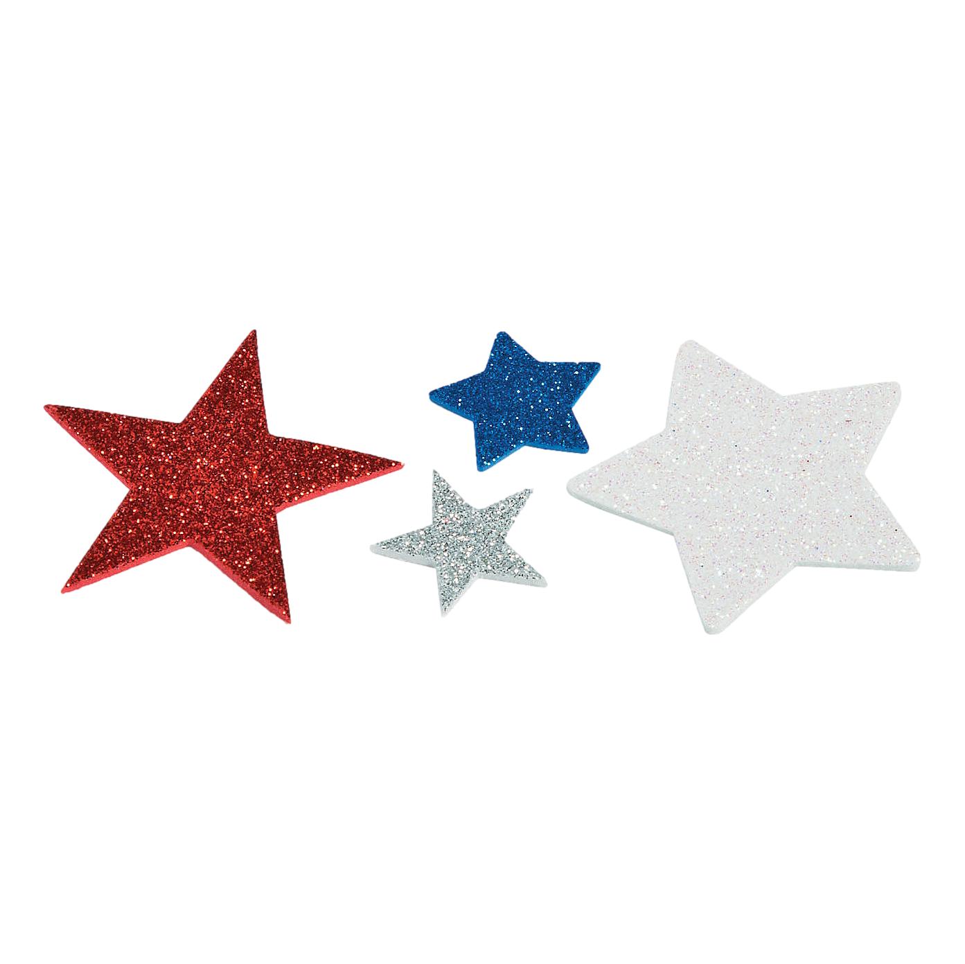 500 red, white, and blue glitter foam star stickers in assorted sizes.