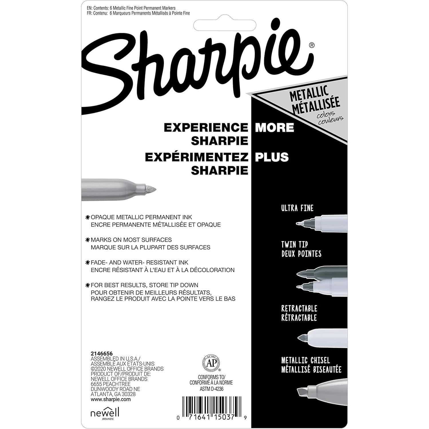 Enhance your creativity with Sharpie Metallic Permanent Markers. Featuring a durable fine-point tip, these markers allow you to create bold and stylish details. Use these metallic permanent markers to design eye-catching signs or add a touch of flair to your labeling projects. Each marker is made with specially formulated, permanent, fade- and water-resistant ink that stands out beautifully on both light and dark surfaces, making them ideal for projects on black backgrounds. The set includes six stunning colors: Metallic Ruby, Metallic Sapphire, Metallic Emerald, Metallic Silver, Metallic Gold, and Metallic Bronze.